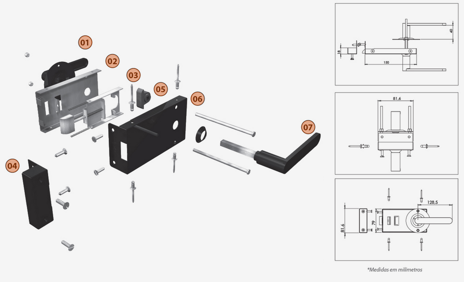 Trinco de sobrepor, aplicado em portas corta-fogo e portas de ferro.