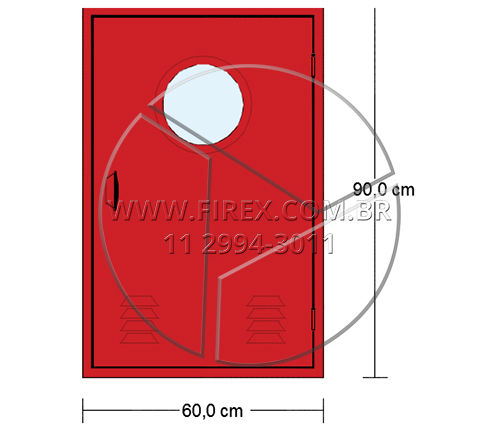 Requadro para mangueira (Hidrante), fabricado em chapa de aço 22 com tratamento anticorrosivo e pintura eletrostática a pó na cor vermelha texturizada. Porta composta por ventilação frontal, dobradiças e fecho tipo engate rápido para facilitar a abertura e visor em acrílico ou acetato, ambas com adesivo “INCÊNDIO”.